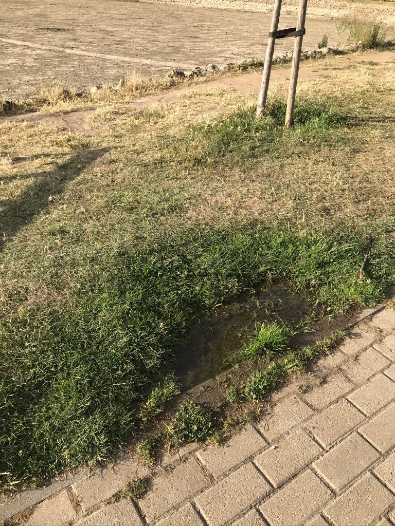 Otro peligro, que no se ve, son las averías del riego con agua reciclada, hay multitud de ellas y no las reparan, sin ir mas lejos observar la primera, agua estancada cerca de una zona infantil de juegos.