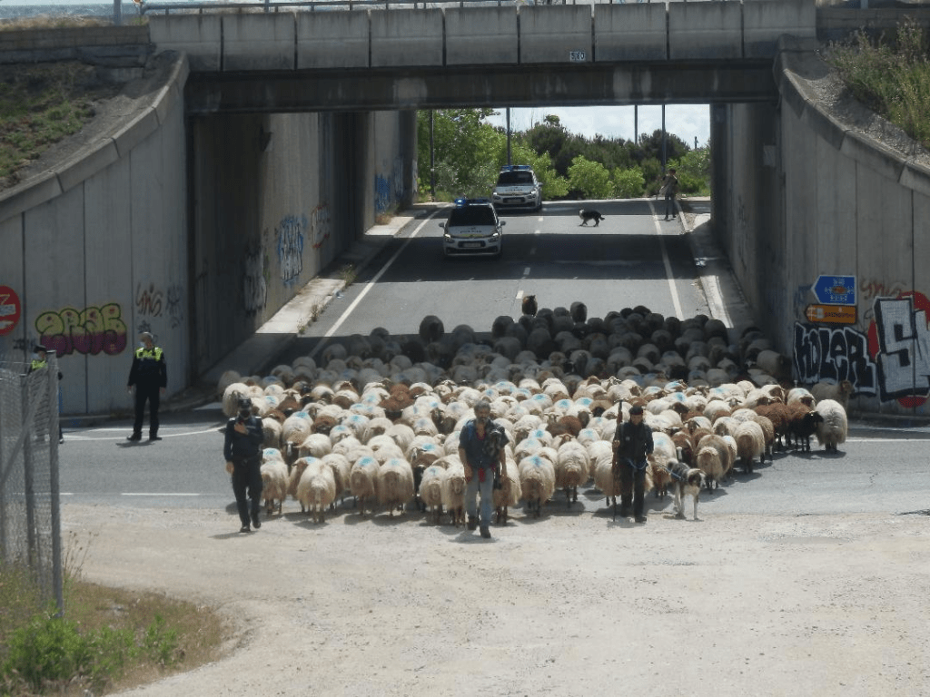 Imagen del rebaño de la Cooperativa Los Apisquillos camino de Puebla de la Sierra desde la Casa de Campo madrileña pasando por el túnel que le ha sido robado por los vehículos a motor, mayo 2019.