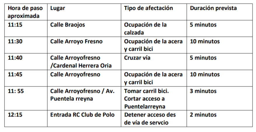 Braojos – Parque – Calle Arroyo Fresno- Anillo Verde Ciclista (GR-124)- Carretera Dehesa de la Villa- Av. De la Complutense- Campus de la Complutense- Anillo Verde Ciclista- Facultad de Veterinaria- Hospital Veterinario- Anillo Verde Ciclista (GR-124)-Crtra del Pardo- Plaza República de Chile- Calle Séneca- Parque de la Florida- Glorieta de San Antonio de la FloridaAv. Valladolid – Puente de la Reina Victoria- Calle de la Ribera del Manzanares- Calle del Rey Plaza de las Moreras – Casa de Campo.
