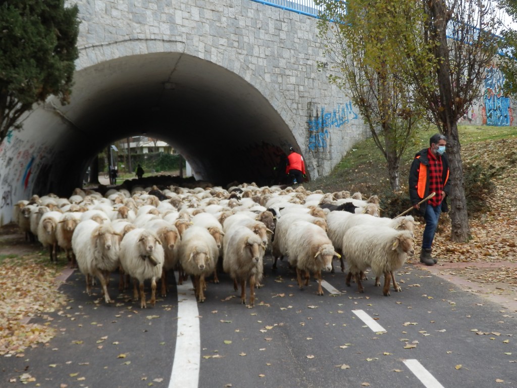 Según Julia, la Mayorala  que cerraba la cola del rebaño, se agolpaba media centena de ciclistas que tuvieron que hacer pie a tierra y someterse al ritmo de las ovejas hasta la altura del Puente de San Fernando. No había sitio para más. Las imágenes son elocuentes. Pasado el tramo estresante junto a la M-30 llegaba un terreno amable y amplio donde las ovejas podían pastar de nuevo, camino de la Ciudad Universitaria, aunque pronto había que cruzar una autovía como es Sinesio Delgado para pasar a la  zona de Paraninfo.