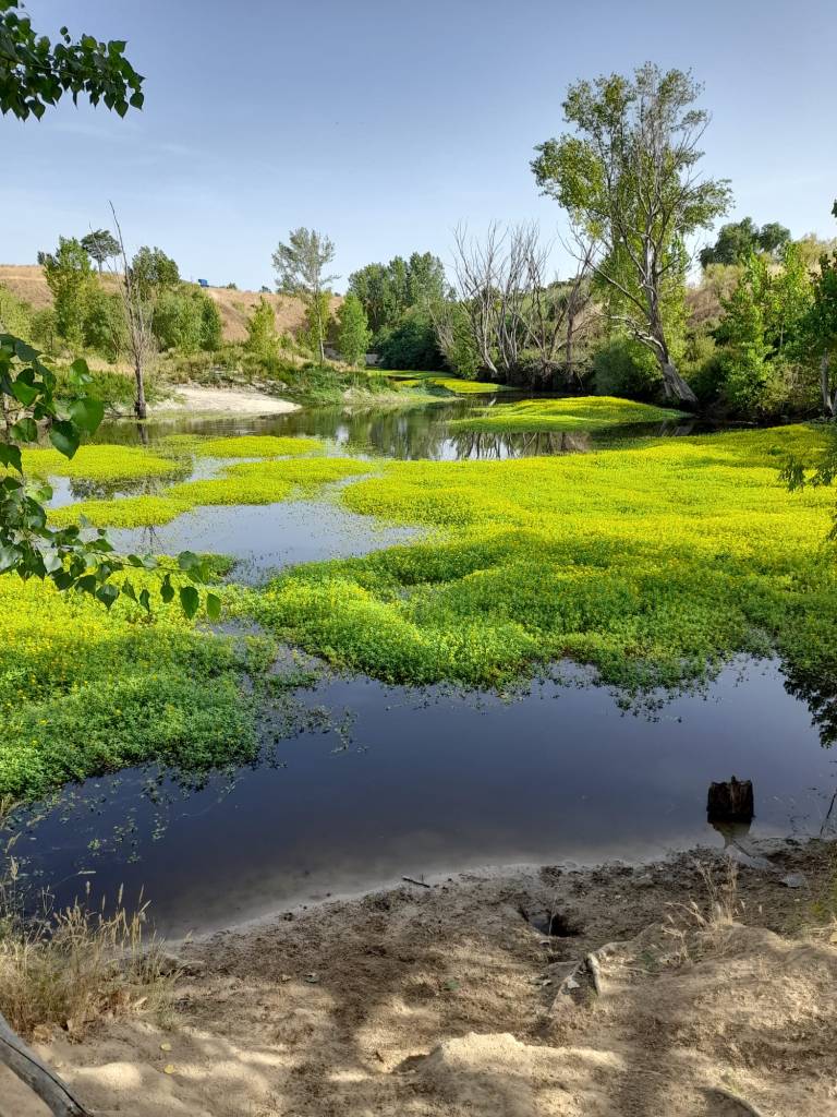 Aún con luz de tarde, se pudo ver el colorido verde esmeralda que proporciona la planta invasora Ludwigia grandiflora al humedal de Meaques – Valchico.