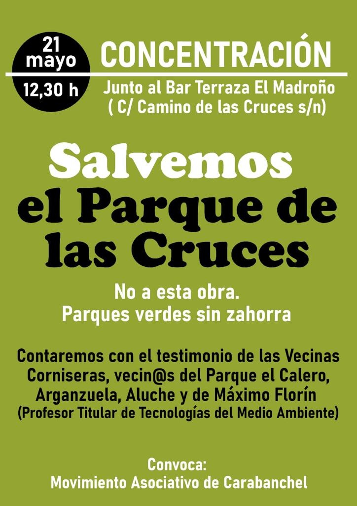 El domingo 21 de mayo, colectivos que defienden los parques de Madrid, se concentraron en el Parque de Las Cruces de #Carabanchel, para denunciar el uso indiscriminado de zahorra artificial, cal y hormigón que desde hace un tiempo se están usando en el proyecto de «Reformas Integrales» que se planifican desde la D.G. DE GESTIÓN DEL AGUA Y ZONAS VERDES del Ayuntamiento de Madrid.