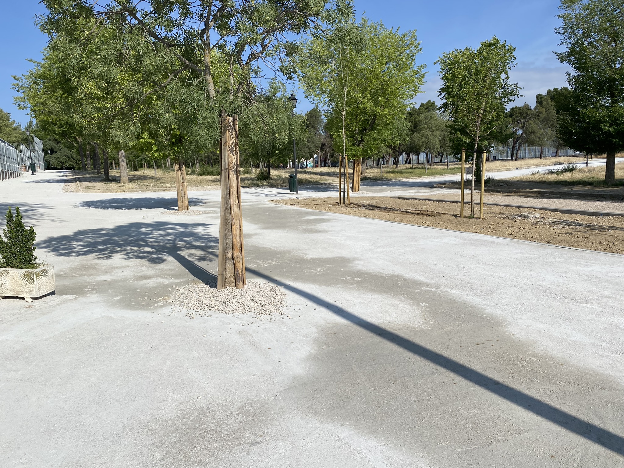 Hace unos meses el Ayuntamiento de Madrid comenzó con la primera fase de la Reforma Integral de una zona importante del Parque, esta remodelación ha consistido, principalmente, en cambiar las avenidas, que antes eran de tierra, por grandes parterres rodeados de zahorra prensada y una capa de cemento con cal blanca hidratada, lo que ellos denominan “zonas verdes y estanciales más amplias y mejor acondicionadas, con nuevo pavimento y en las que se optimizará la red de drenaje con criterios de sostenibilidad.