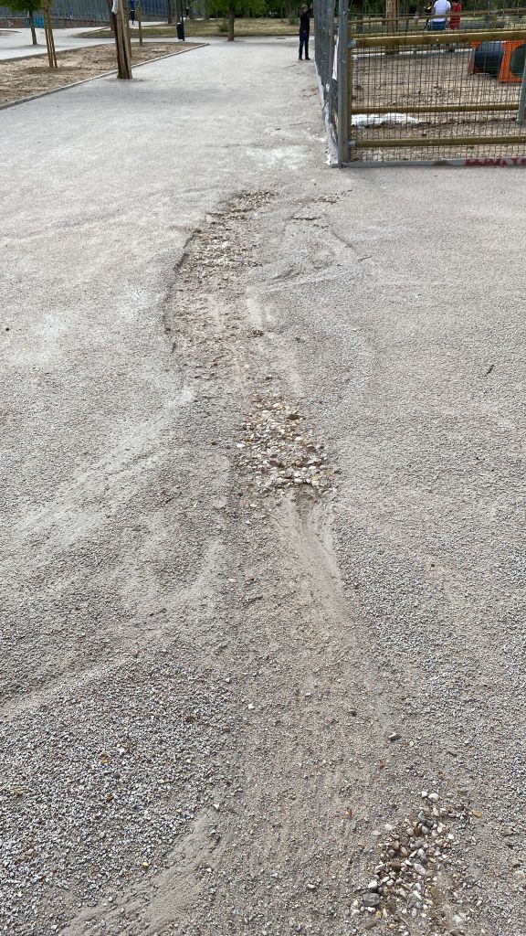 Tal y como demuestran las fotos y videos capturadas en los últimos días en los parques de Las Cruces, La Cornisa, El Calero, Aluche y otros, como consecuencia de las lluvias, parte de las zonas cubiertas por zahorra se están desintegrando y el agua ha arrancado el material, junto con polvo, granos y hasta trozos enteros de la superficie. Por ese efecto erosivo, están apareciendo socavones en un pavimentado que ha sido instalado hace semanas (como sucede en Las Cruces).