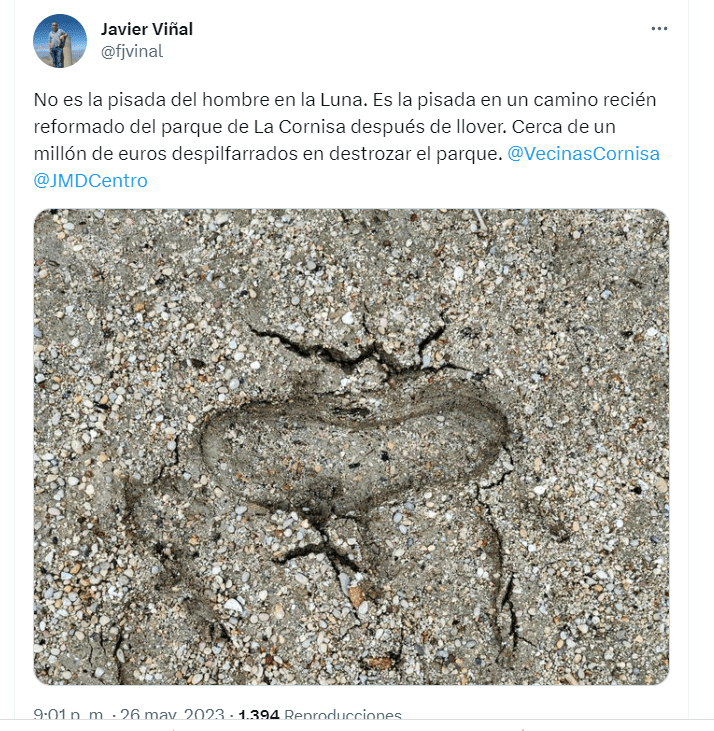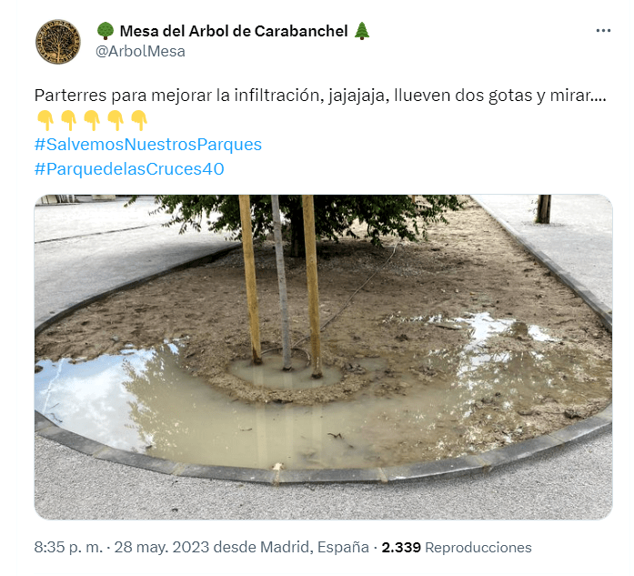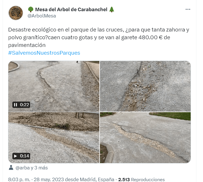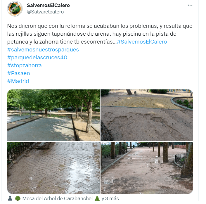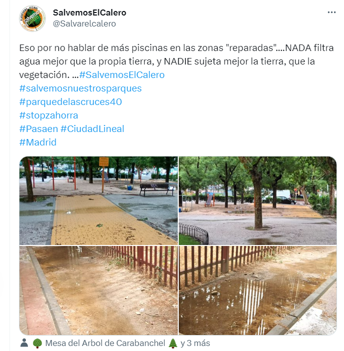 Desde la plataforma “Salvemos nuestros parques”, Enrique Astiz, del parque El Calero, manifiesta que: “Nos querían convencer de que, con este pavimento encima de la tierra natural, bien apisonado, por supuesto, y mezclado con cal hidratada para que fragüe de forma adecuada, no se iban a producir charcos (¿a quién molestaban?) y tampoco escorrentías (¿?) que, según ellos, generaban problemas de seguridad en nuestros mayores. Y lo más importante: que no íbamos a tener que gastar en mantenimiento. Pero las lluvias de estos últimos días nos han demostrado que nuestros dirigentes nos han vuelto a mentir. Las imágenes que hemos visto en el parque de Las Cruces, en La Cornisa, en El Calero y tantos otros lo demuestran. Eso sí, las constructoras amigas responsables de la ejecución de las obras siguen engrosando su facturación con los millonarios presupuestos destinados a esta campaña”.