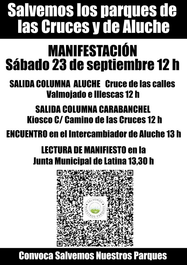 Como respuesta ciudadana a las actuaciones que está llevando a cabo el Ayuntamiento de Madrid con las obras de remodelación de los parques de Aluche y Las Cruces, donde se ha iniciado la II Fase de remodelación, diversas agrupaciones, plataformas y asociaciones vecinales, lideradas por la plataforma “Salvemos Nuestros Parques” convocan el sábado 23 una gran manifestación de protesta.