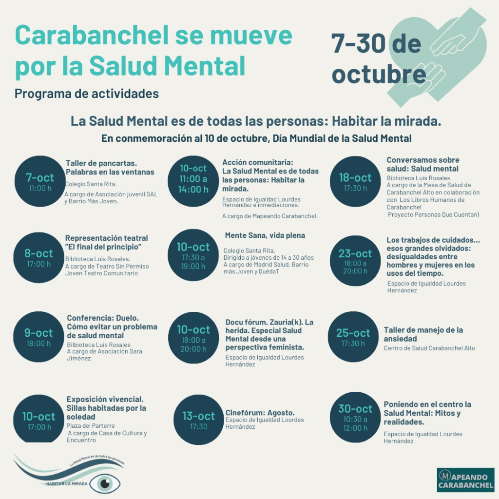 Con motivo del día 10 de octubre JORNADA MUNDIAL POR LA SALUD MENTAL en el distrito de Carabanchel se han organizado numerosas actividades comunitarias por parte de todos los activos de salud.