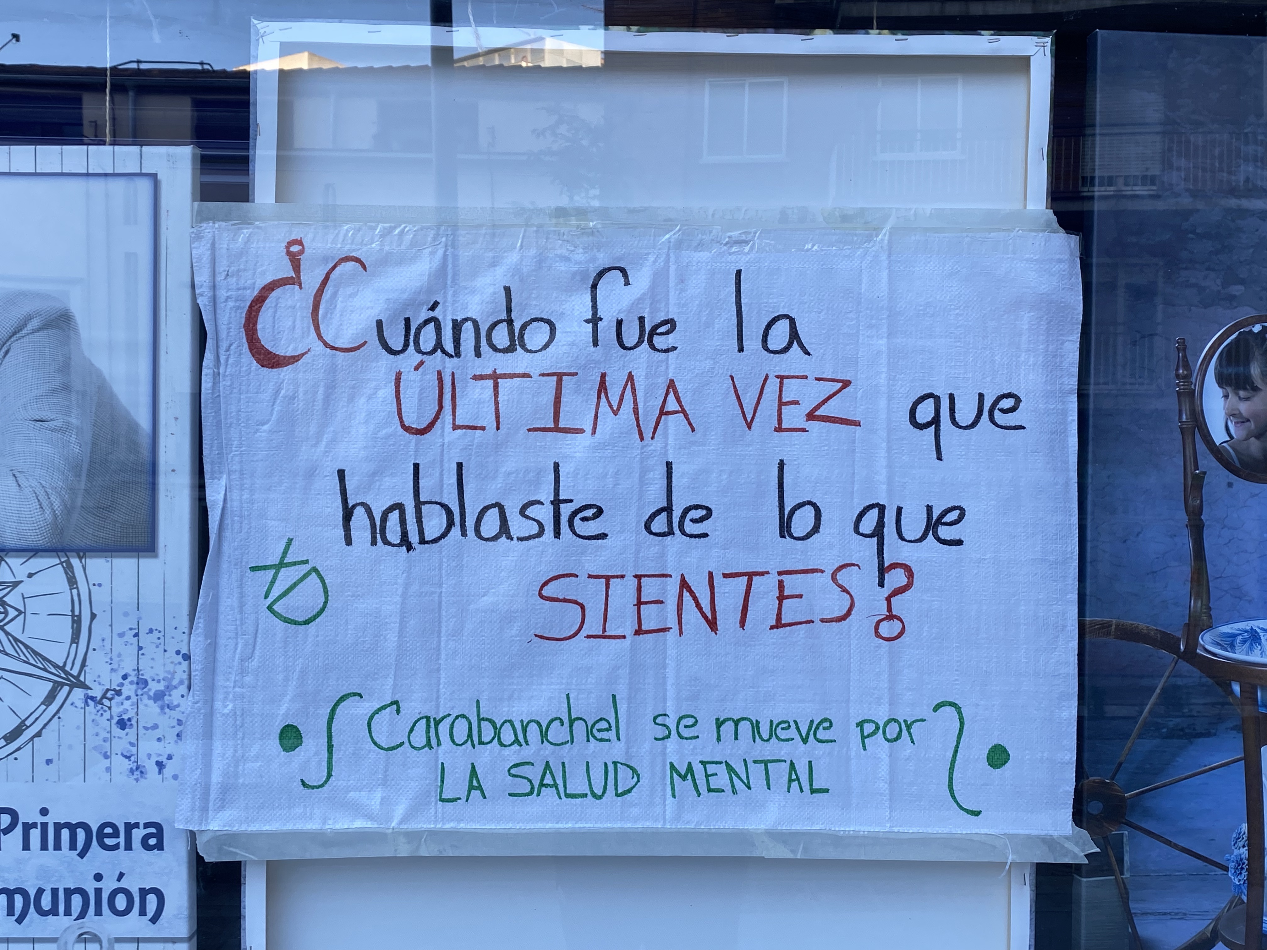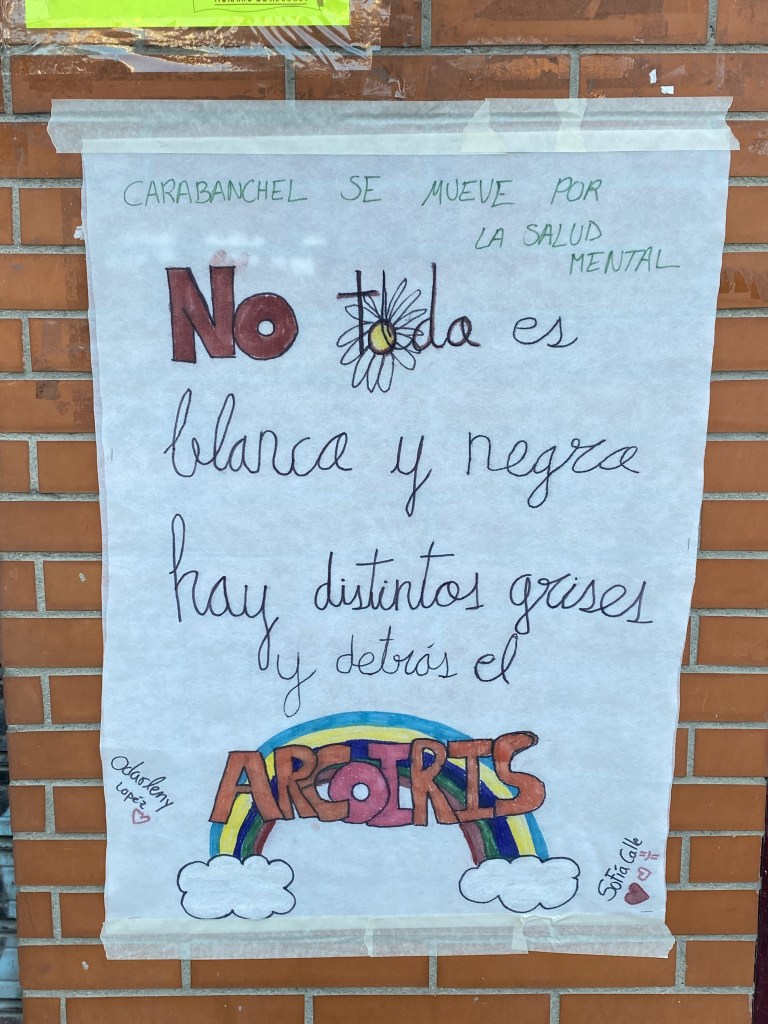 Por eso hemos querido desde todos los activos de salud que nos encontramos en Mapeando Carabanchel, dar una respuesta comunitaria, con el marco “Carabanchel se mueve por la salud mental: La salud Mental es de todas las personas” pintadas de pancartas con jóvenes donde expresar cómo viven estas cuestiones y a la colaboración de los comercios poniéndolos en escaparates, teatro, talleres, presentación de libros, cinefórum…