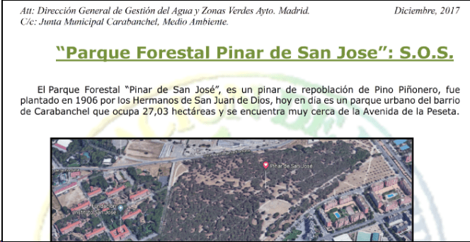 Desde la Mesa del Árbol de Carabanchel llevamos trabajando desde el año 2017 en la defensa de nuestras zonas verdes, una de ellas es el Pinar de San José. Justo ese año se cayeron varios pinos centenarios , con el peligro que eso supone, y preparamos un informe exhaustivo para poner en conocimiento de la Junta Municipal y el Área del Ayto. su situación, luego llego Filomena y acabo de destrozarlo.