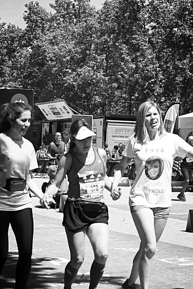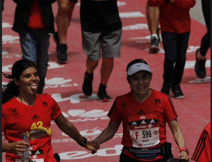 Esta foto es muy especial, es la llegada con Gema, hicimos juntas la primera maratón y llegamos apoyándonos la una a la otra, ella con 28 años y yo con 58.