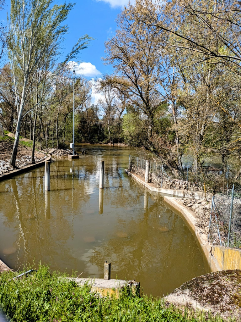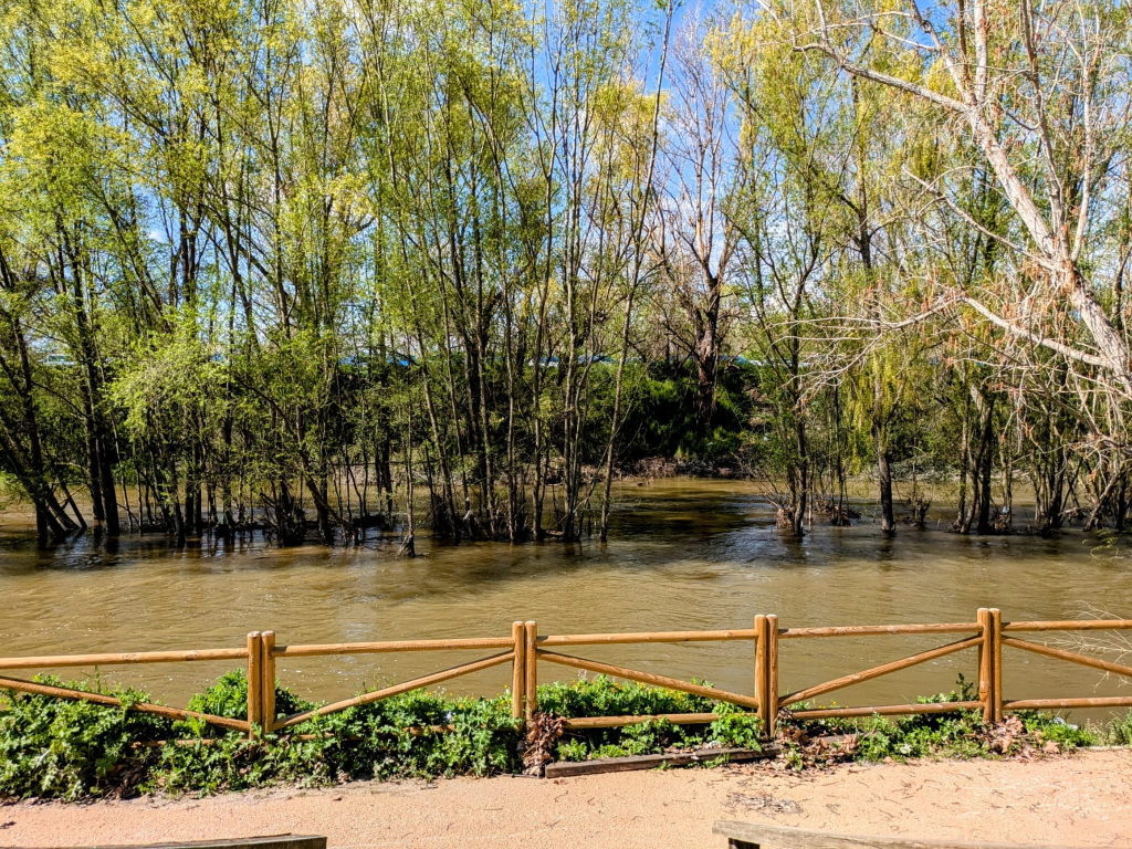El recorrido hacia Somontes, ahora por la pista del Anillo Verde Ciclista, es un continuo de árboles de ribera de gran porte y vegetación asociada. La anchura del río es espectacular tras un mes de marzo que bate todas las marcas de lluvias registradas desde siempre. A la izquierda de la marcha tenemos la tapia histórica de la Casa de Campo (1722 has) en esa parte segregada del parque conocida como Club de Campo que ocupa 210 has del total mencionado.