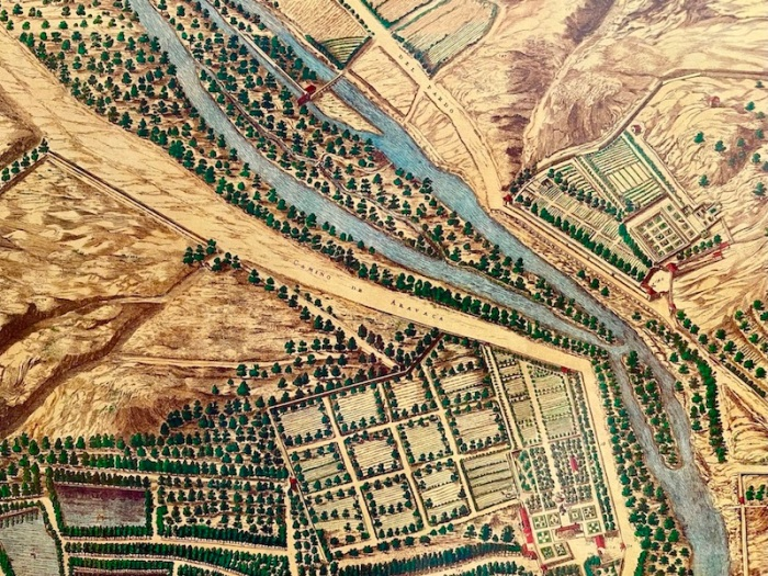 A la altura de Casa Mingo tenemos el elegante Puente de la Reina que con un solo ojo libra por completo el paso de las aguas del Manzanares. Vemos como la vegetación espontánea ha crecido en estos años de renaturalización en las muchas isletas que han surgido de forma natural. La dinámica de las aguas vuelve a imponer sus leyes y trata de recuperar su fisonomía según vemos en planos antiguos
