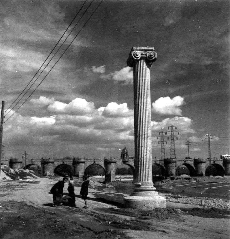 La canalización del Manzanares en el tramo urbano de la capital , desde el Puente de los Franceses hasta Legazpi, realizada entre 1914 y 1929, fue paralelo a la construcción de los colectores que motivaron la instalación de esas falsas columnas jónicas. Esa canalización no tenía nada que ver con la actual de paredes de granito ya que eran unas planchas de cemento que descendían, casi siempre, suavemente hasta el borde del rio. Aún quedan algunos restos de aquella construcción en las cercanías del Pte de los Franceses incluso con impactos de proyectiles de la guerra.